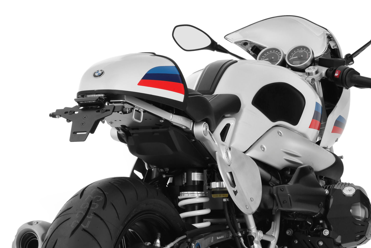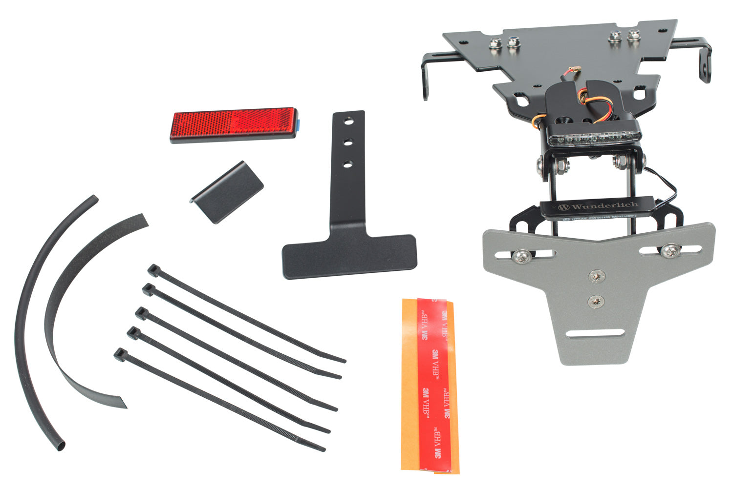 Scope of supply: Base carrier for installation below the seat with 3 possible indicator positions, Rear light version of your choice, license plate carrier, rear light bracket with flush transition to seat, cat’s eye /- carrier.