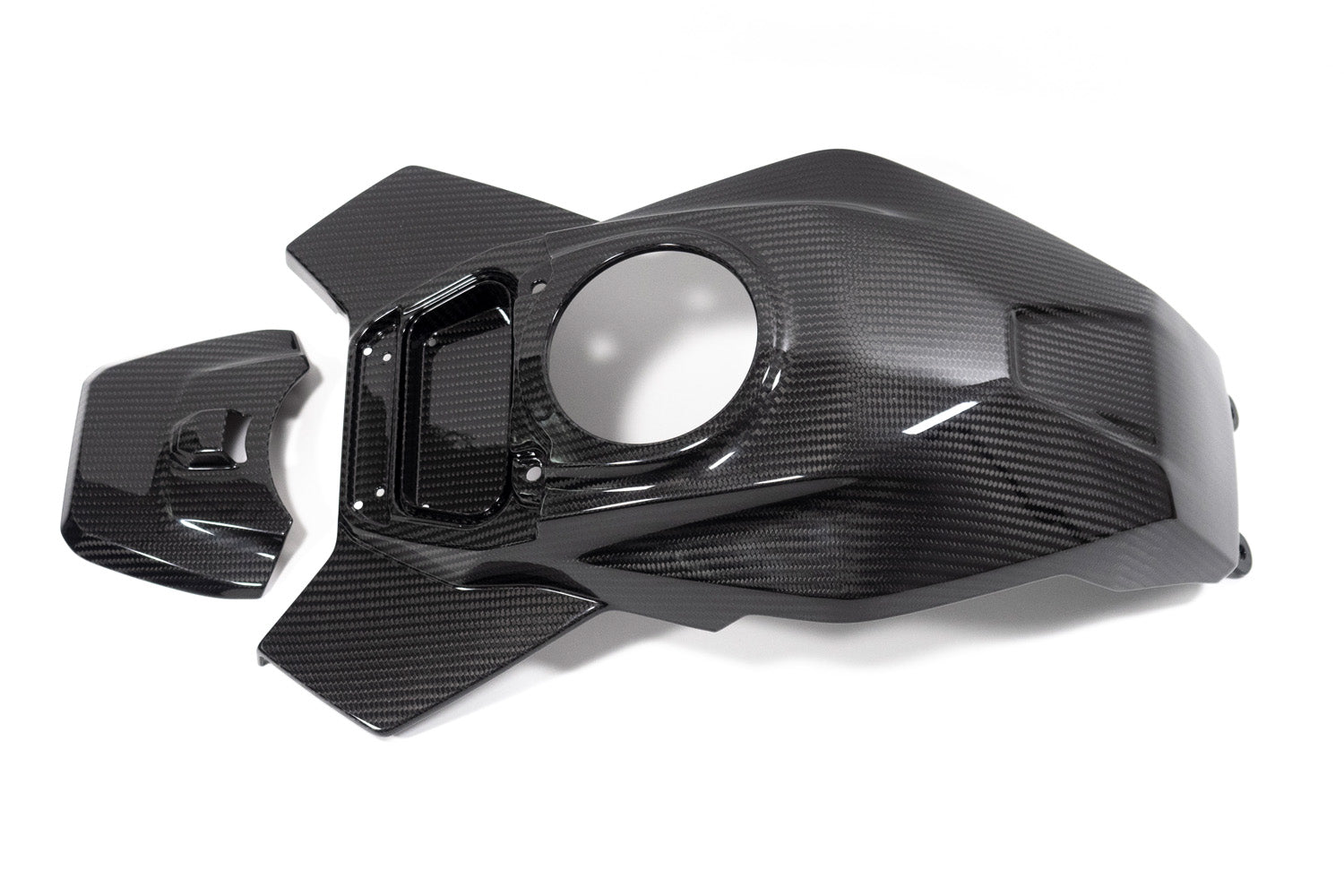 This space age material unfolds its full potential with up to 70% weight decrease compared to the standard part and its weight-specific stiffness. Form follows function here and integrates optimally into the design of the motorcycle. The contours of the machine are incorporated as well as the material and surface texture of neighbouring series components. This carbon component underscores the high-tech claim of your BMW with the unique appeal of real carbon.