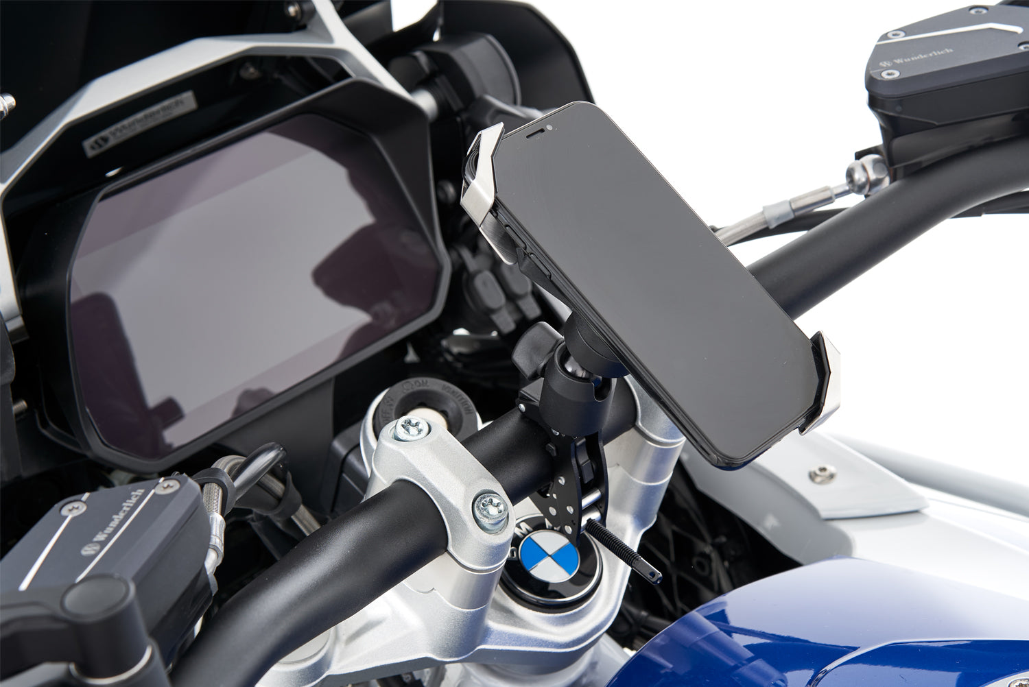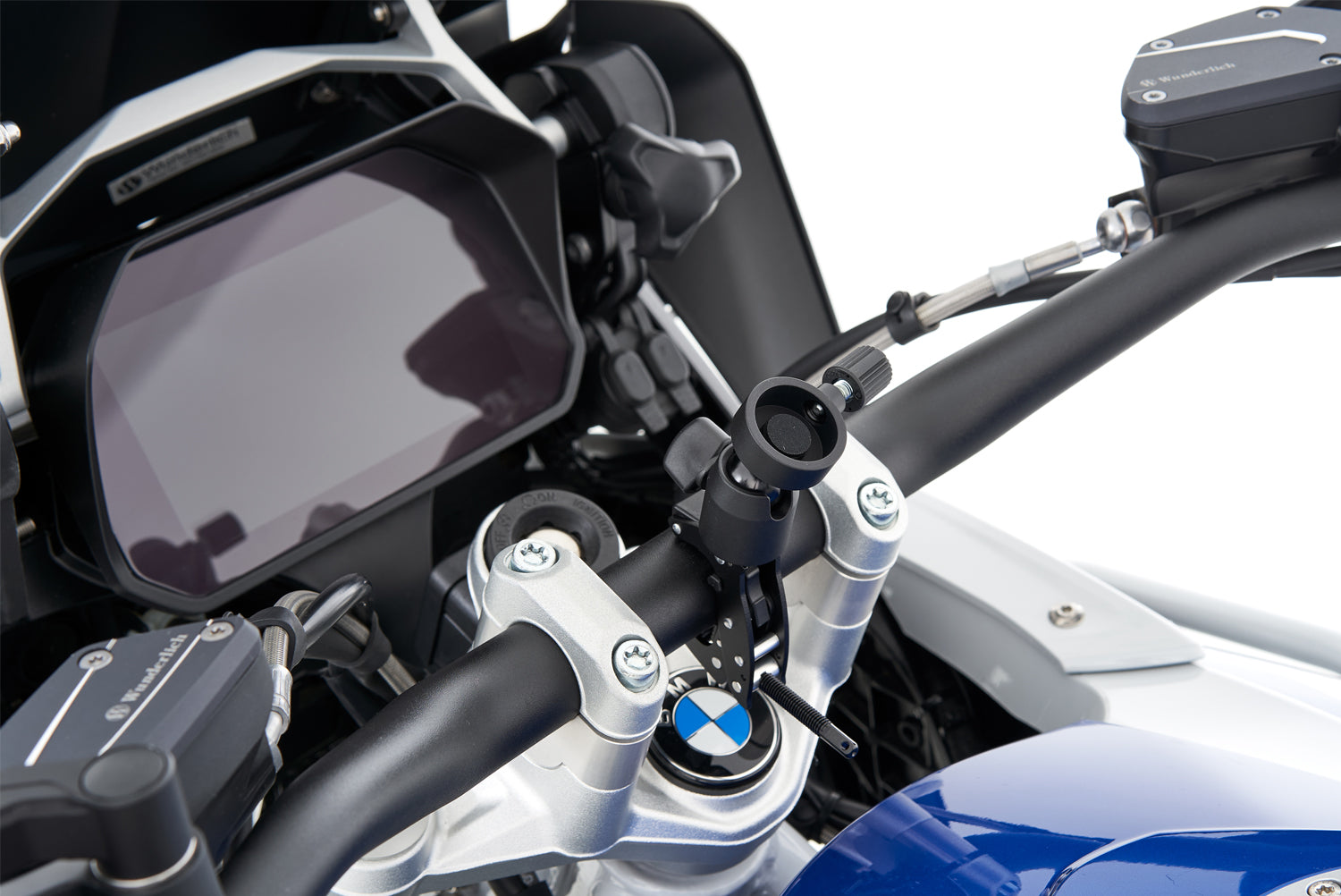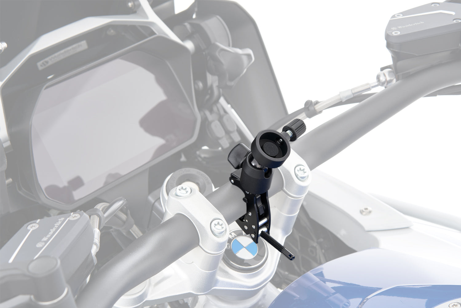 The MULTICLAMP comes with a ball joint that can be rotated 360° and locked. Together with the quick release system, it provides a versatile use base for accommodating the MULTICLAMP smartphone 45155-102 or ActionCam holder  45155-202