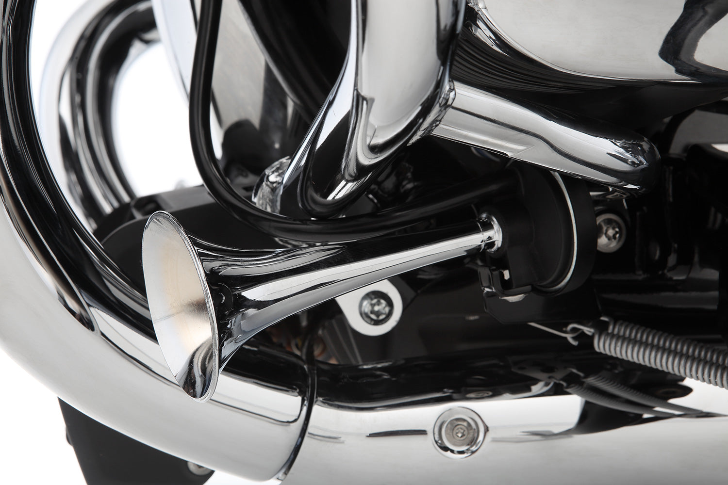The two-tone horn consists of high-performance fanfare horns that are mounted directly next to the manifold while leaving the lean angle unrestricted. Mounted in this position, the high-quality chrome-plated horns are not only acoustically impressive, but also set a special accent visually with the gleaming chrome! Real fanfare horns are air-powered, just like in this case. Our developers have positioned the powerful compressor in a suitable spot by the steering head, covered by a discreet fairing. The fairing is powder-coated in glossy black to match the frame. Two air hoses supply air to the fanfare horns.