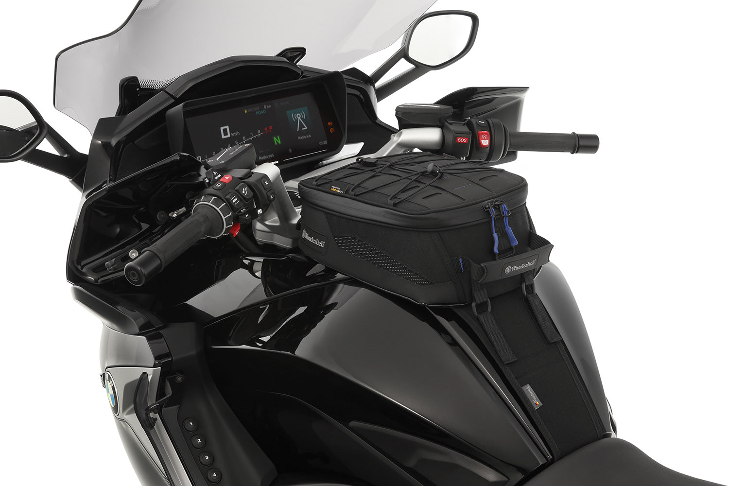 The mounting system is attached to the vehicle with minimal hand pressure and the tank bag can be quickly fastened to it. Push the holding tongue of the tank bag through the holder and close it from the front. An easy and (and therefore brilliant) quick-release system lets you attach and remove the tank bag while wearing gloves or with wet fingers.