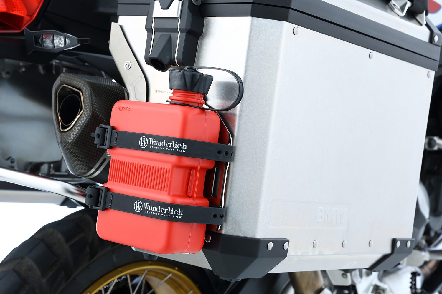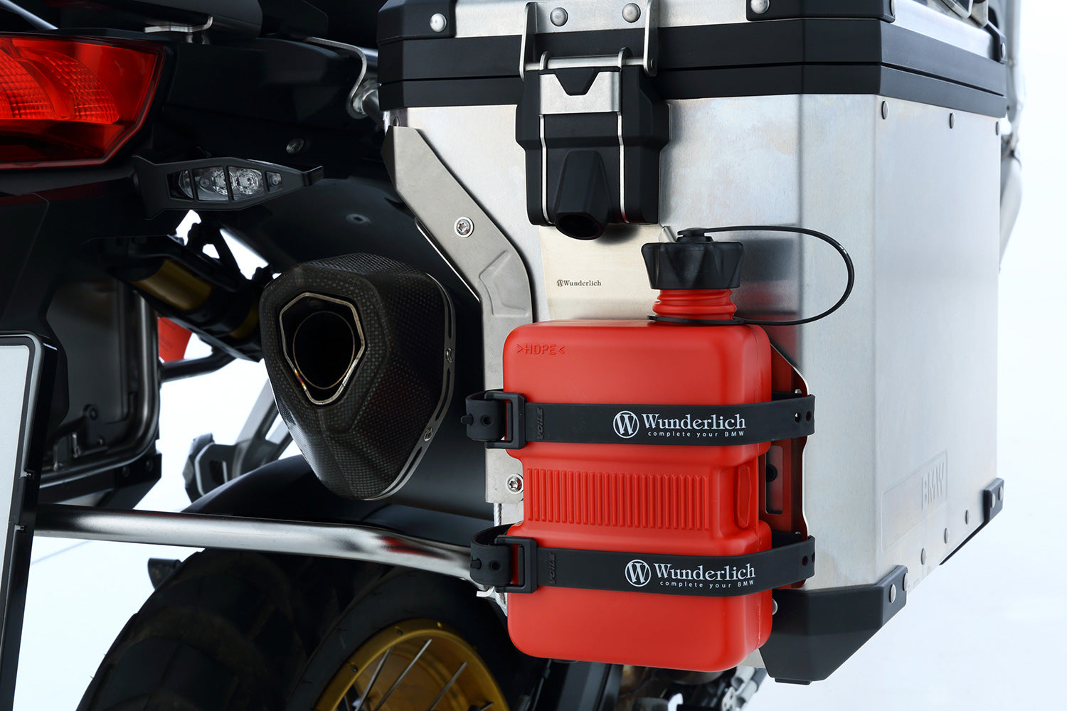 Our case rack is the perfect addition to cases for everything that either needs to be quickly to hand or has no place in a case. It holds the usual travel canisters for petrol and oil bottles as well as compact storage canisters for water or other travel utensils. Who hasn't experienced the annoyance of liquids leaking out - especially when travelling. And the freed-up luggage volume can certainly be used for better things. The solid stainless steel rack is conveniently designed to hold two of our aluminium bottles (art. no. 43583-000) next to each other. In this way, oil and petrol, for example, can be conveniently carried separately. The bottles are secured by means of straps and the lashing holes integrated in the rack. Our practical webbing straps (art. no. 25120-012 - please order separately) are perfect for securing all kinds of objects to the rack.