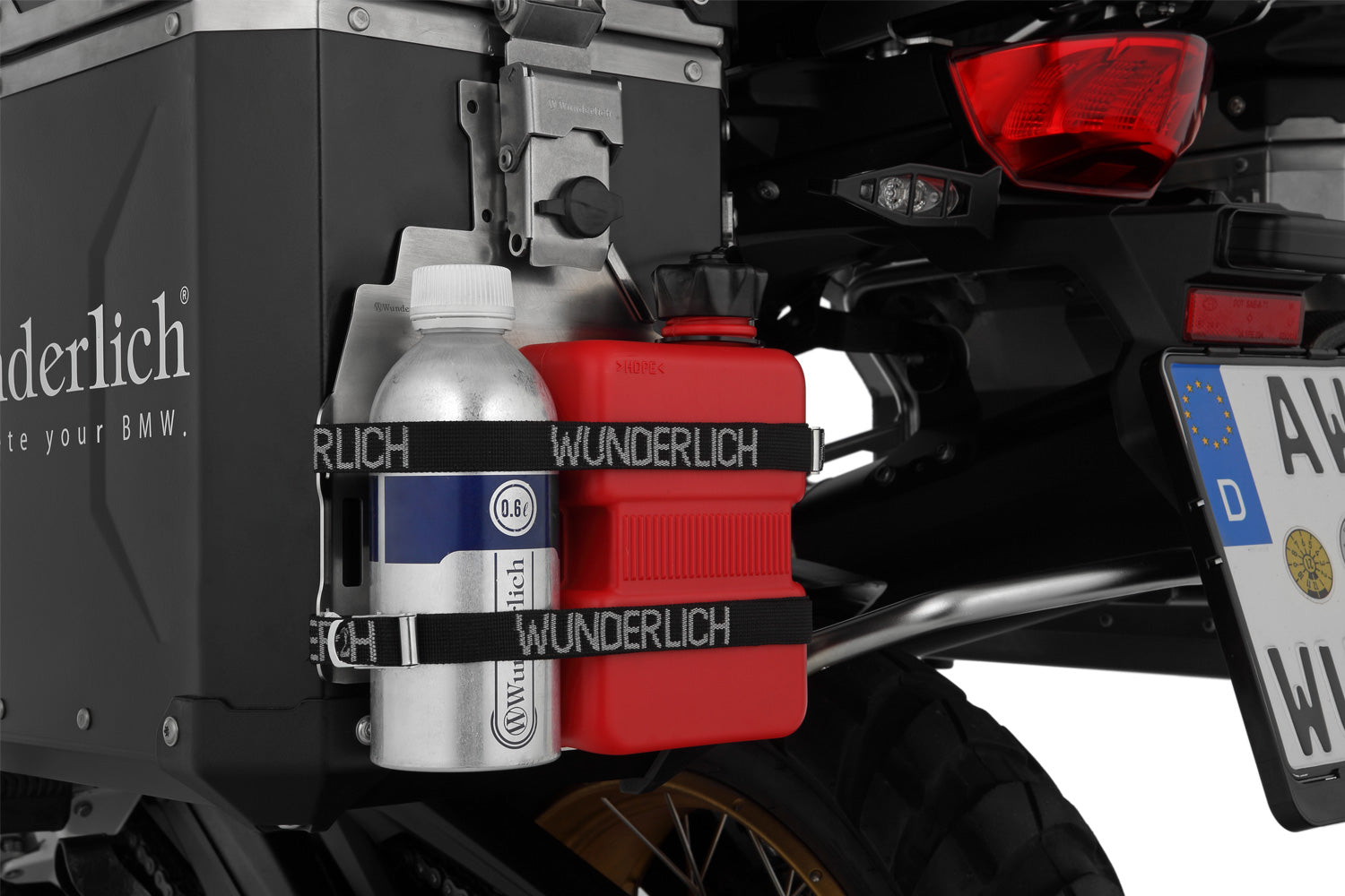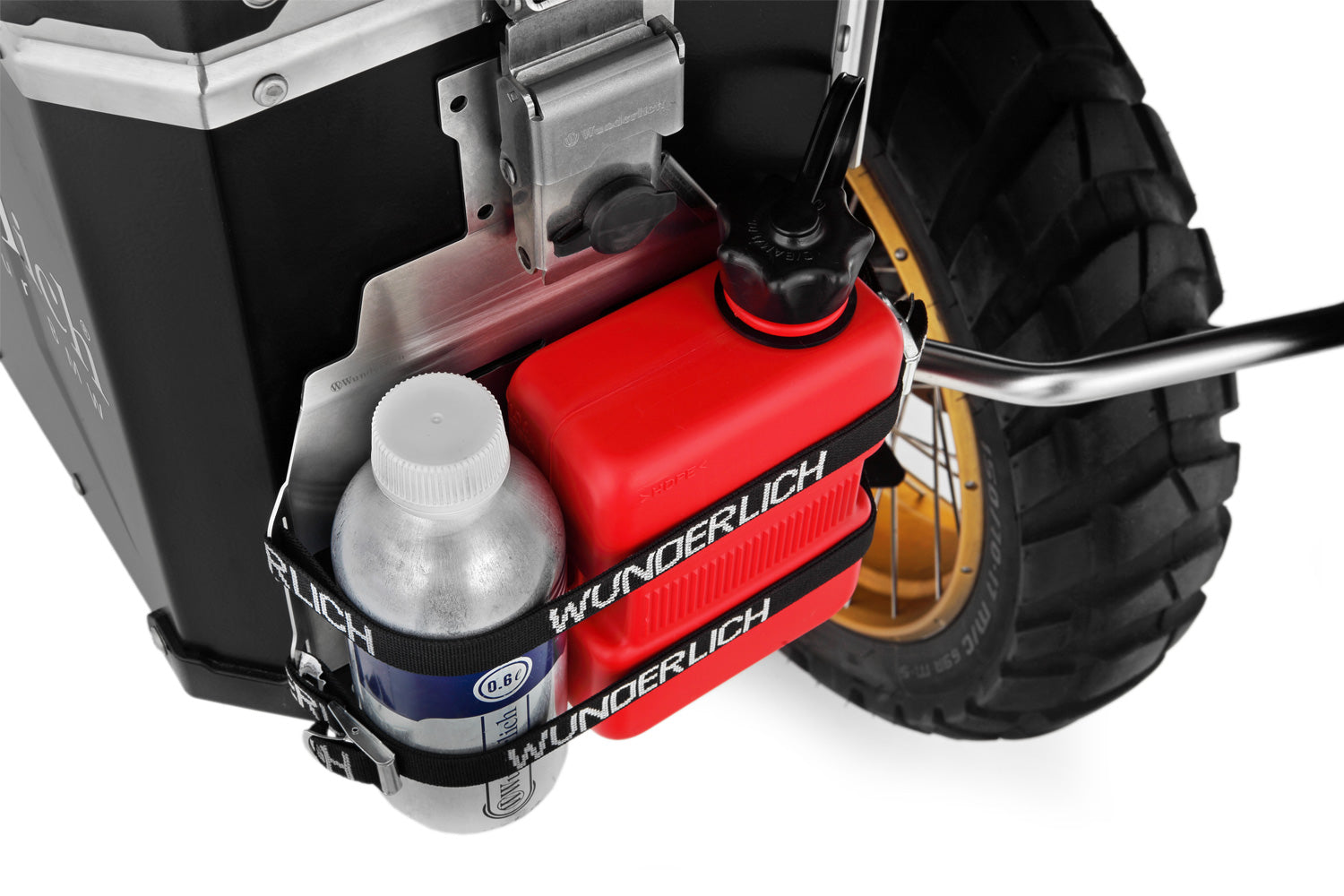 Our case rack is the perfect addition to cases for everything that either needs to be quickly to hand or has no place in a case. It holds the usual travel canisters for petrol and oil bottles as well as compact storage canisters for water or other travel utensils. Who hasn't experienced the annoyance of liquids leaking out - especially when travelling. And the freed-up luggage volume can certainly be used for better things. The solid stainless steel rack is conveniently designed to hold two of our aluminium bottles (art. no. 43583-000) next to each other. In this way, oil and petrol, for example, can be conveniently carried separately. The bottles are secured by means of straps and the lashing holes integrated in the rack. Our practical webbing straps (art. no. 25120-012 - please order separately) are perfect for securing all kinds of objects to the rack.