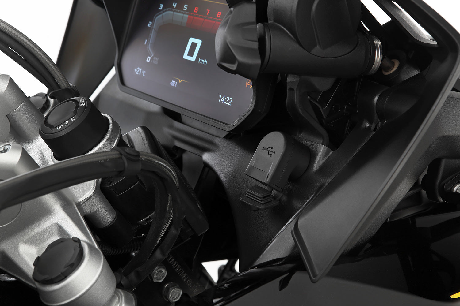 This means there’s no need for drilling. The original DIN or USB socket also remains usable together with the cockpit fairing. A special wrench with a wrench width of 22 mm is supplied for this purpose, so you can simply remove the socket and reposition it in the same position in the cockpit fairing where it is easily accessible. We recommend using it with our dual socket (Part no. 45011-000).