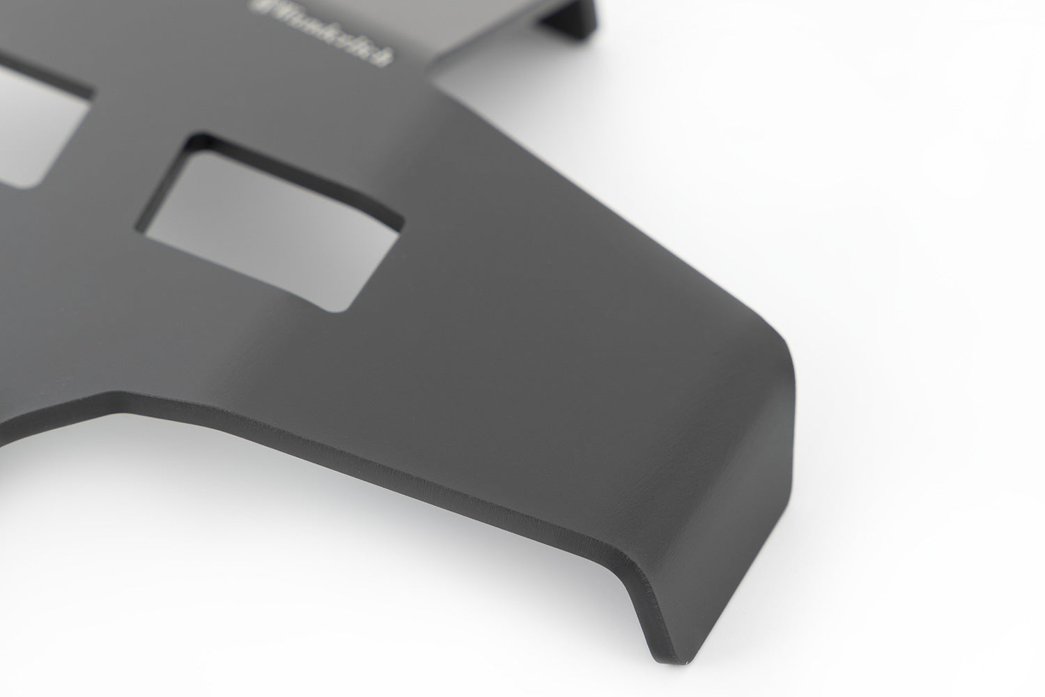 The uncomplicated assembly of the protection system made from high-quality aluminium is therefore done right on the easily accessible engine protection bar. A component thickness of four millimetres, the form-fitted, unshakeable attachment, which screws on with two double-screwed clamps. These are convincing features for a robust and durable construction that’s like a protective shield. The three striking cut-outs provide ventilation, their characteristic dynamic form which flattens out towards the back integrates seamlessly into the design. All of this taken together forms a sophisticated - and in the truest sense of the word - comprehensive protection concept for the vulnerable cylinder heads. We manufacture the cylinder head protection in a choice of silver or black anodised.