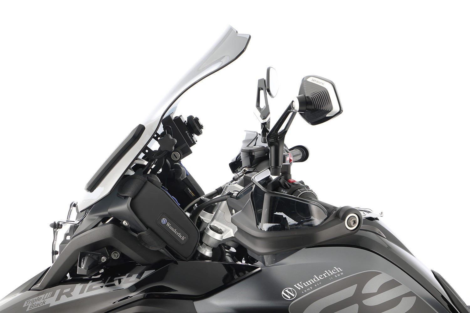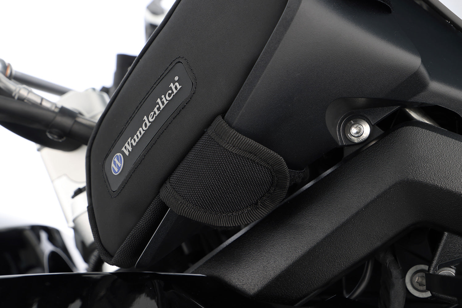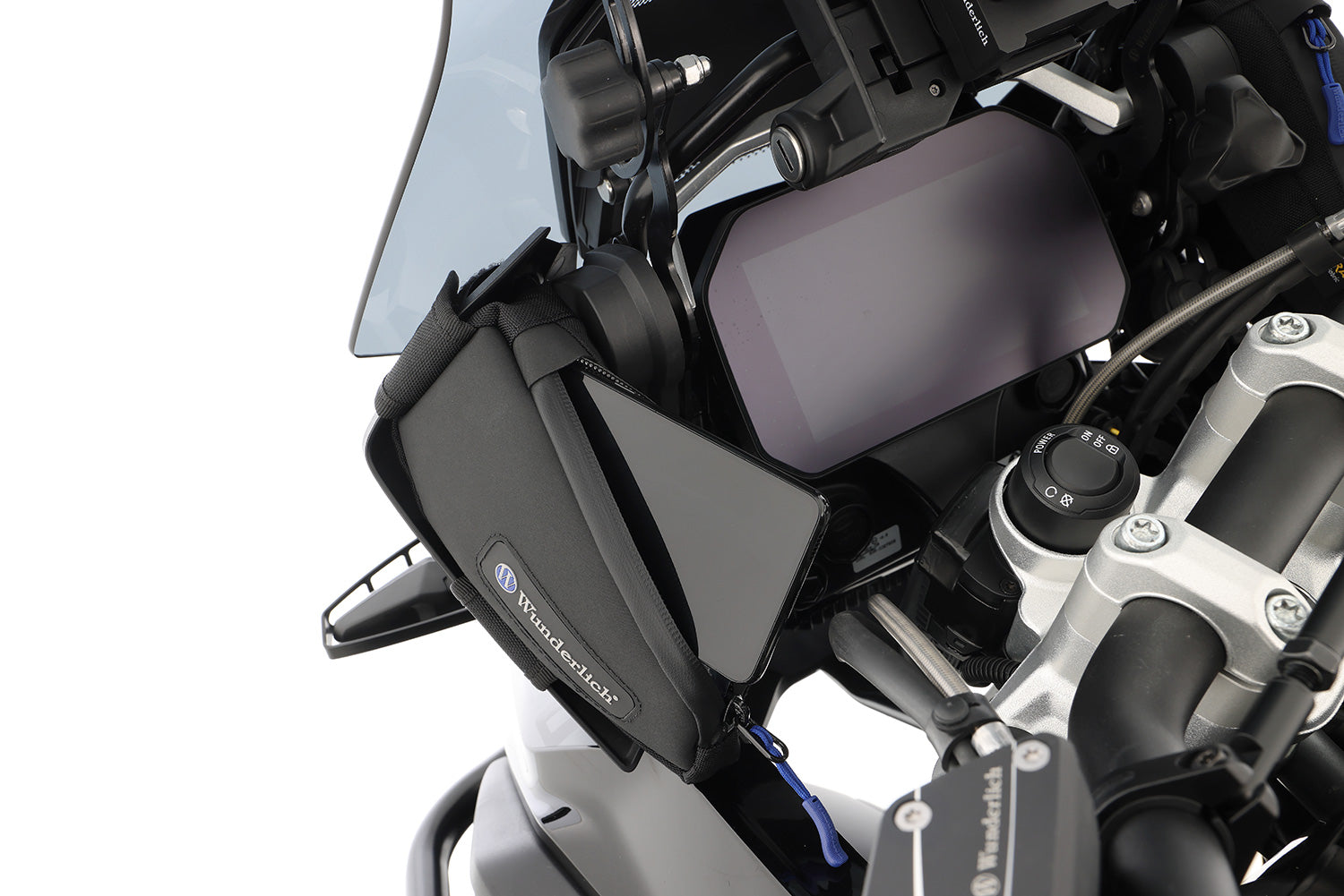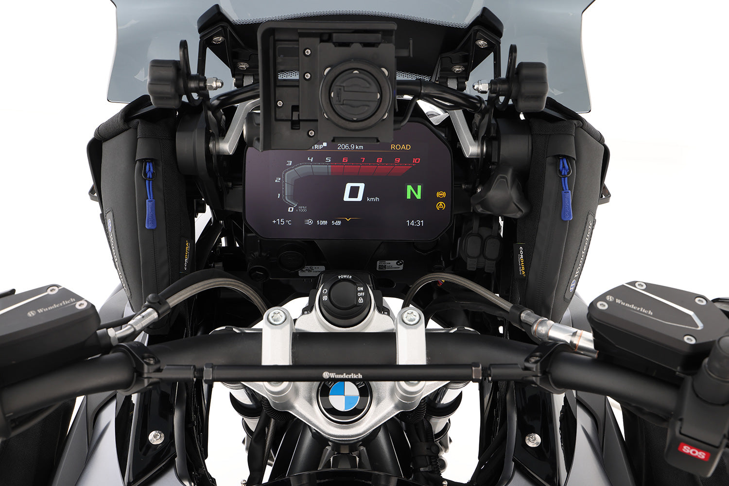 Fits R1200 GS LC | R1250 GSWe have designed the functional bags in this set specifically to make intelligent use of the space created when using the optional wind deflectors. With these bags, we also placed great emphasis on securing good accessibility while on the road, helping you find your well-protected items quickly and easy. You then have a dedicated place for your vehicle documents and wallet. We have also optimised the clear design for large smartphones, such as the iPhone 14 Pro Max. The left-hand bag comes with a waterproof E-Connect cable input, so that smartphones and other devices can be charged while on the go. The bags are quick and easy to attach and remove using two strong Velcro strips. These also ensure that the bags don't flap about while you're riding. Thanks to their multi-layer design, the bags retain their shape even when empty. This also protects the contents from vibrations. The zips come with easy-to-grab clasps. They are water-repellent, dust-tight and also covered when closed. The fluorocarbon-impregnated CORDURA fabric used is extremely abrasion-resistant, UV-stable, water-repellent and also coated on the inside. The same applies to the blue inner lining, which provides the necessary contrast for finding small items quickly and easily. With Wunderlich brand logo.