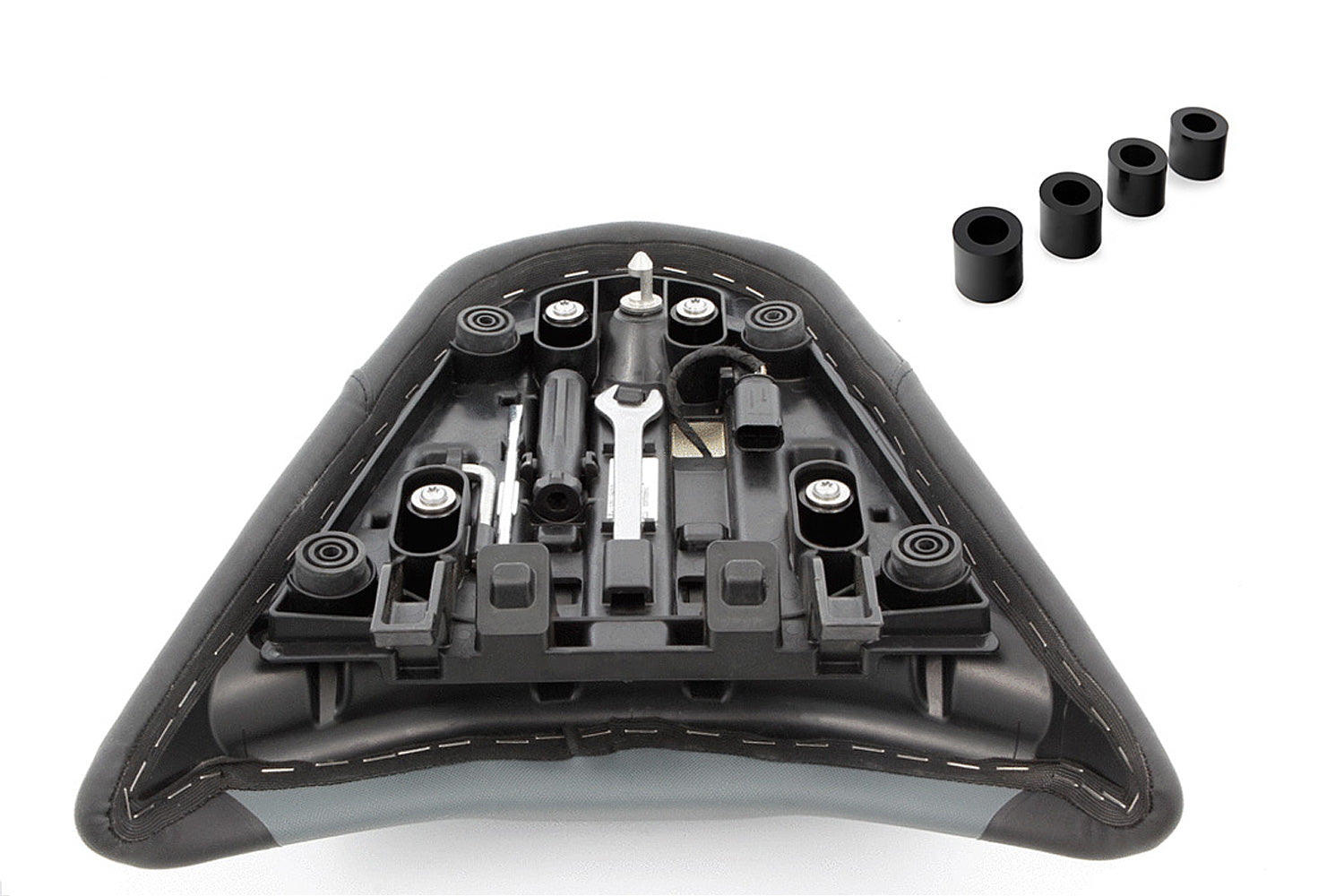 With the standard passenger seat of the BMW R 1300 GS, the seat element can be adjusted in the installed state by a spring-loaded mechanism to the front or the rear position. Since the mechanism technically requires a certain amount of play, the passenger seat sits quite loosely, which can convey to the passenger an insecure feeling of instability during operation. With our fixing kit, the seat is permanently and play-free fixed in the preferred position, providing firm hold and thus a secure feeling. The fixing kit consists of four solidly dimensioned plastic sleeves, which replace the standard springs.