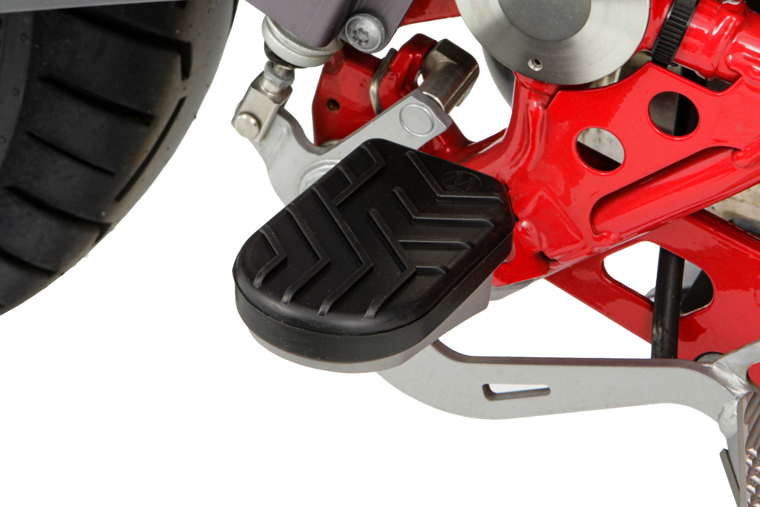 With this in mind, we have developed our rubber footrest pad for normal everyday use – for travelling, the daily commute to the office or simply riding around the city. Its profiled surface offers perfect grip. The pads are positively mounted and not only protrude over the edge of the original footrests but also surround them – so any shin contact is guaranteed to be painless! Oh, and your shoes will also remain unblemished. In addition, they ensure a pleasant damping of the engine vibrations. The secure attachment of the footrest pads is ensured thanks to the precisely shaped counterholder, which is attached from below via two screw fastenings. And when the terrain gets rough, they can be quickly and easily removed so you can enjoy some hard riding.