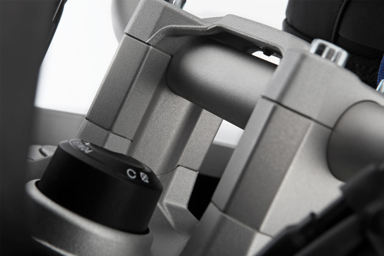 The handlebar riser specially designed by our developers raises the handlebar by 40 mm. The rise proves ideal for dynamic enduro or off-road riding when standing. The ergonomic effects are particularly significant for taller riders, as they have a relaxing effect on the entire back musculature and arms while also relieving the spine, pelvis, and coccyx. This significantly improves touring suitability and comfort. Plus, relaxed riding provides an additional level of passive safety, just like the improved visibility of traffic conditions resulting from the more upright seating position.