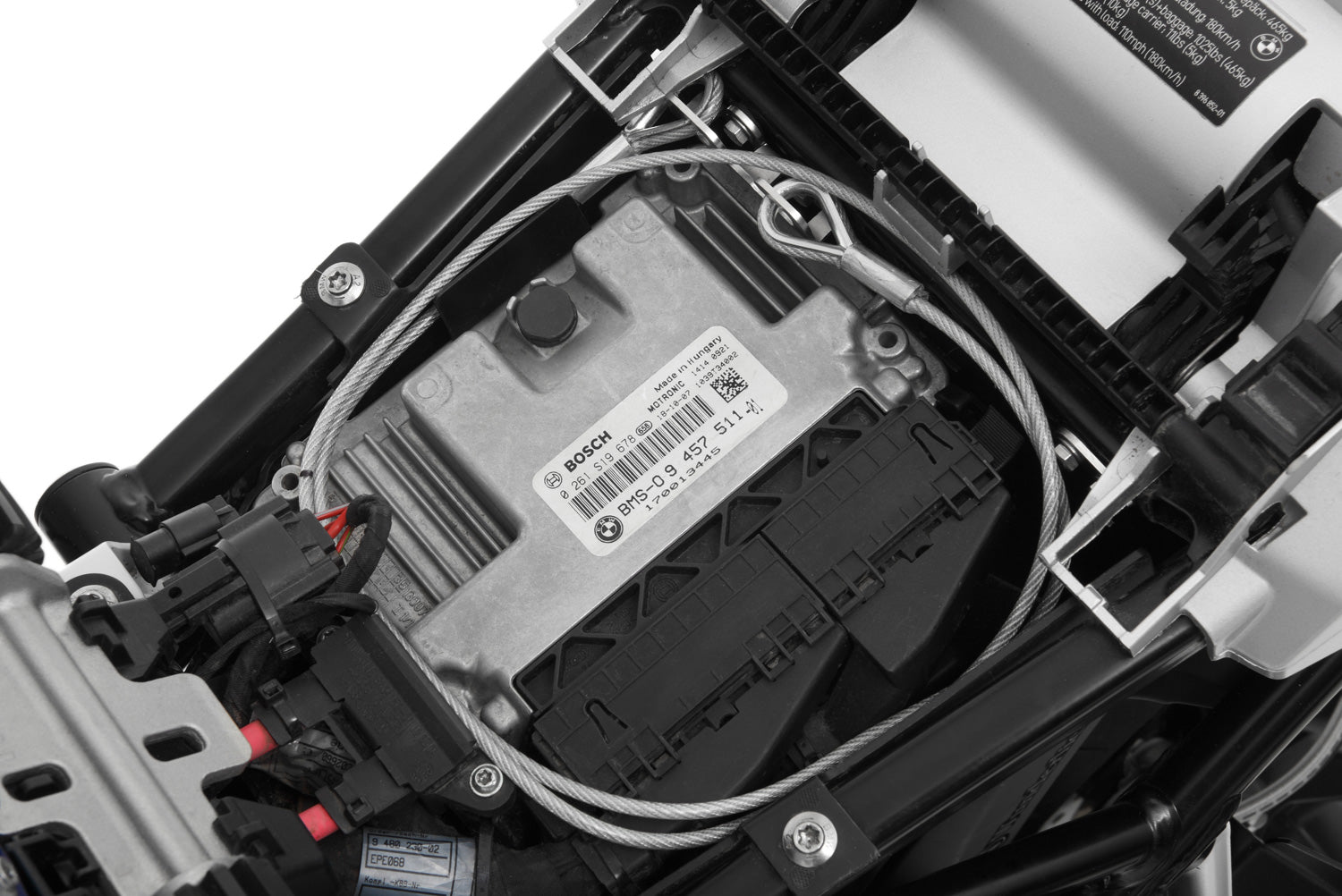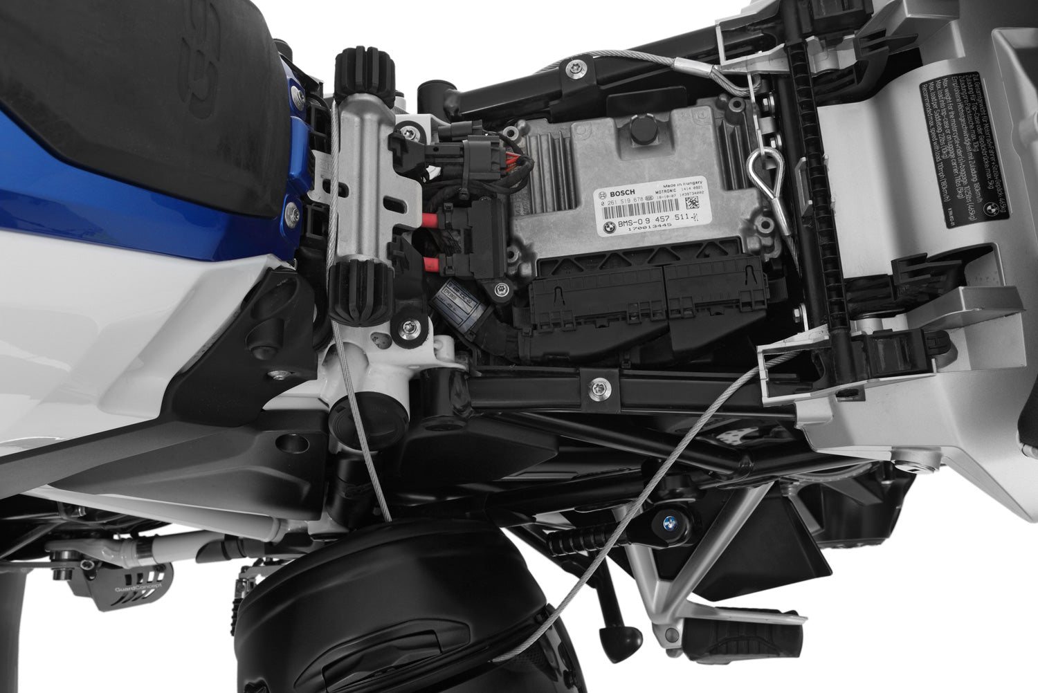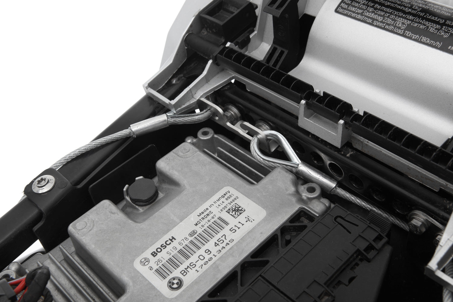 A secure yet easy-to-use handy helmet lock for the R 1250 GS. The steel cord attaches beneath the passenger seat and is also secured with a spring-supported bar. The loops are pressed extremely sturdily and also reinforced with a steel thimble. This means it is impossible to open the loops without pulling up the seat.
