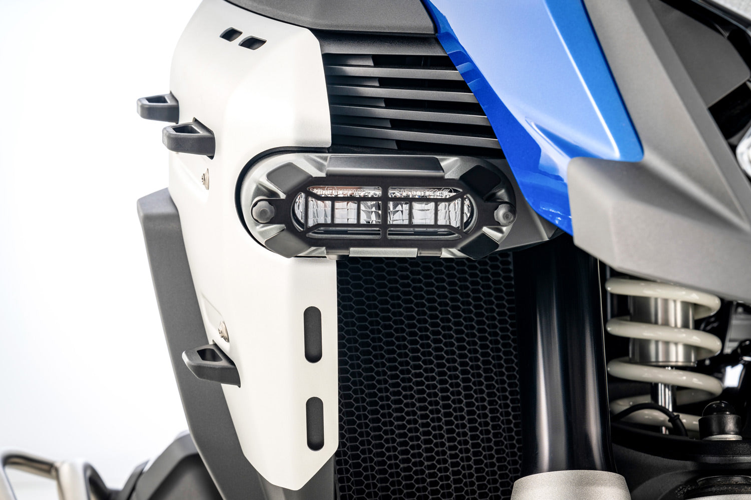 Wunderlich protective grille: Robust protection for the oval, integrated original LED auxiliary lights of the BMW R 1300 GS Adventure! Against stone chips. Against flying debris. And against whipping branches.