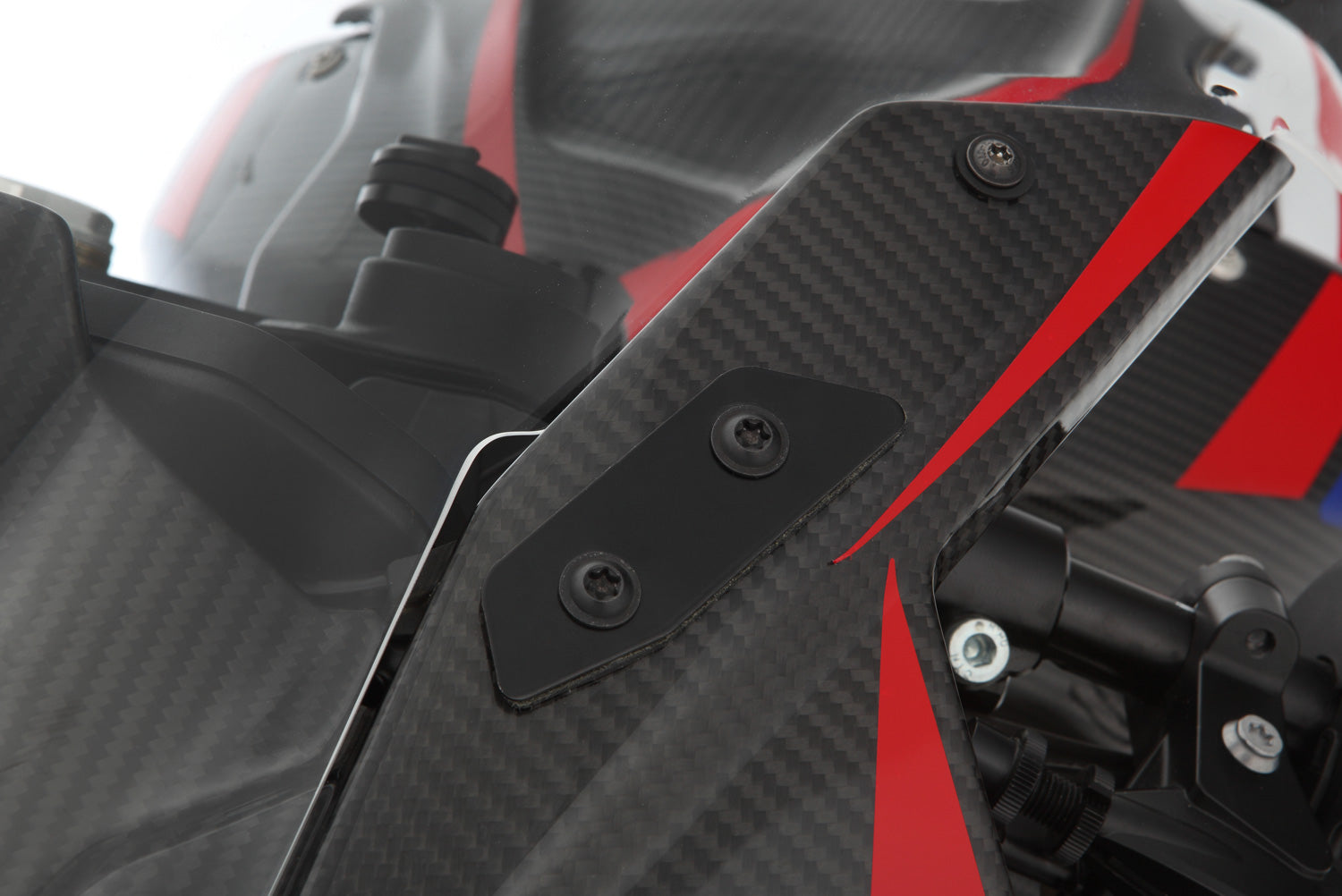 The fairing mirrors are among the components that are disassembled for race condition for the purposes of aerodynamics and safety. Removing the fairing mirrors results in two unsightly openings in the fairing. Our high-quality covers made of aluminium close these openings. They are cut precisely to contour and equipped with a suitable, self-adhesive and protective foam rubber underlayer. The covers are each fitted using two screws that come with the set.