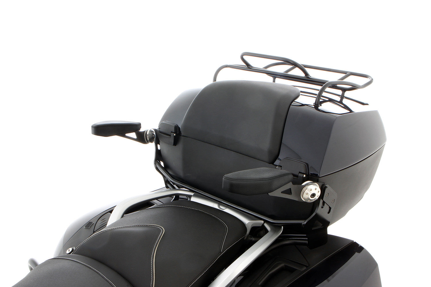 Our armrests provide travelling comfort and ergonomics, as well as maximum safety via additional lateral support. The armrests can be continuously adjusted to suit your personal requirements: you can adjust the width, height and angle. They fold away so that you can simply fold them up e.g. for climbing on comfortably. The armrests can be used any way you like while riding too. The joint is easy to get to. You can use the top case with zero restrictions as usual and it doesn’t need to be modified in order to mount the armrests.