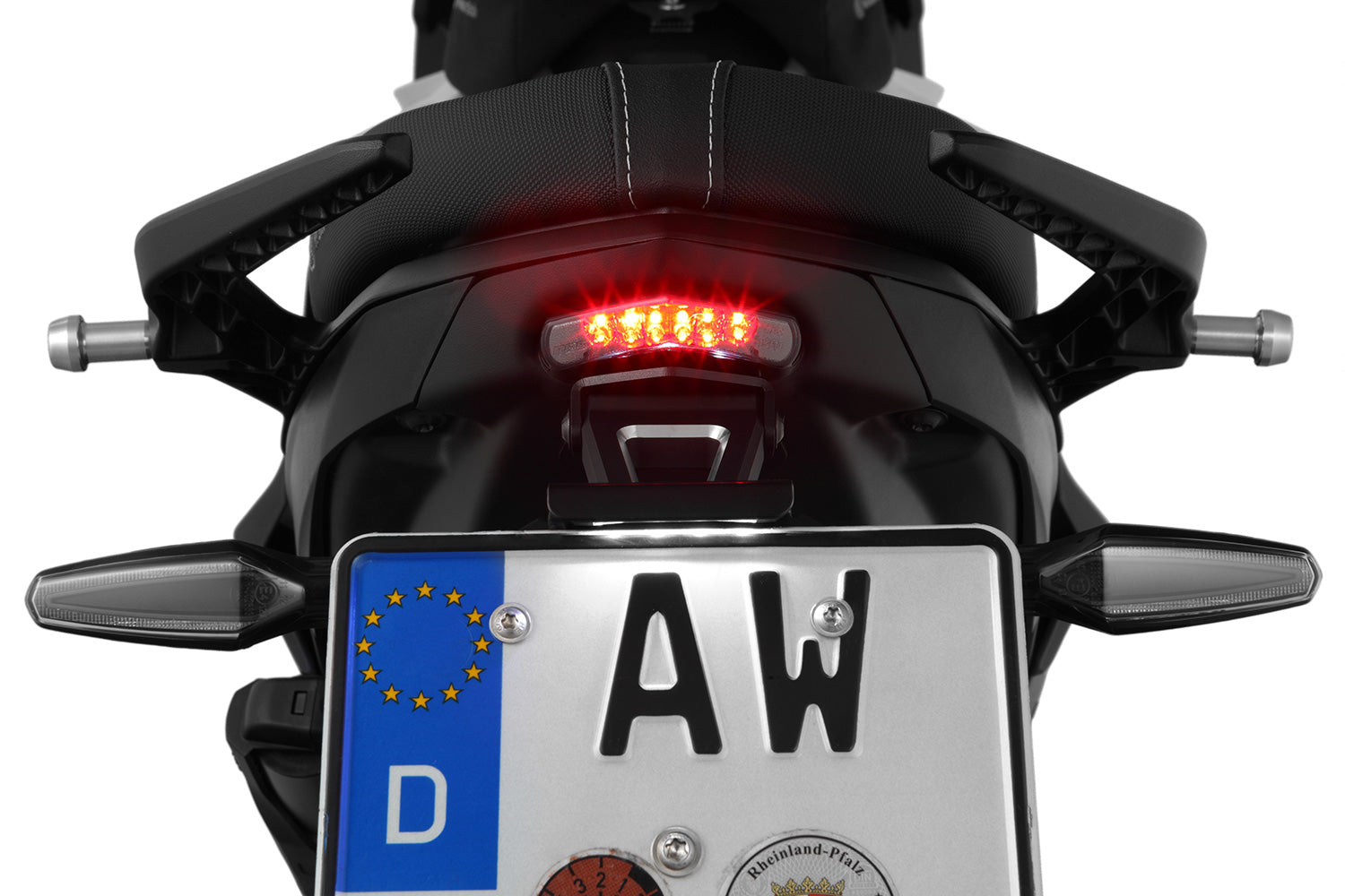 The adapter cable for the uncomplicated, comfortable electrical connection of the indicators and the accompanying LED licence plate light supplied (with E test mark) are ready to use.