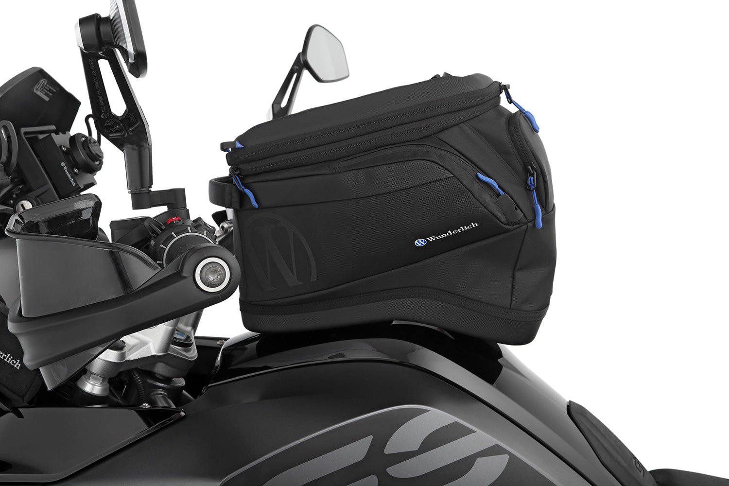 - A waterproof luggage bag can be buttoned to the tank bag. It is blue and thus offers a good contrast and overview of the contents.