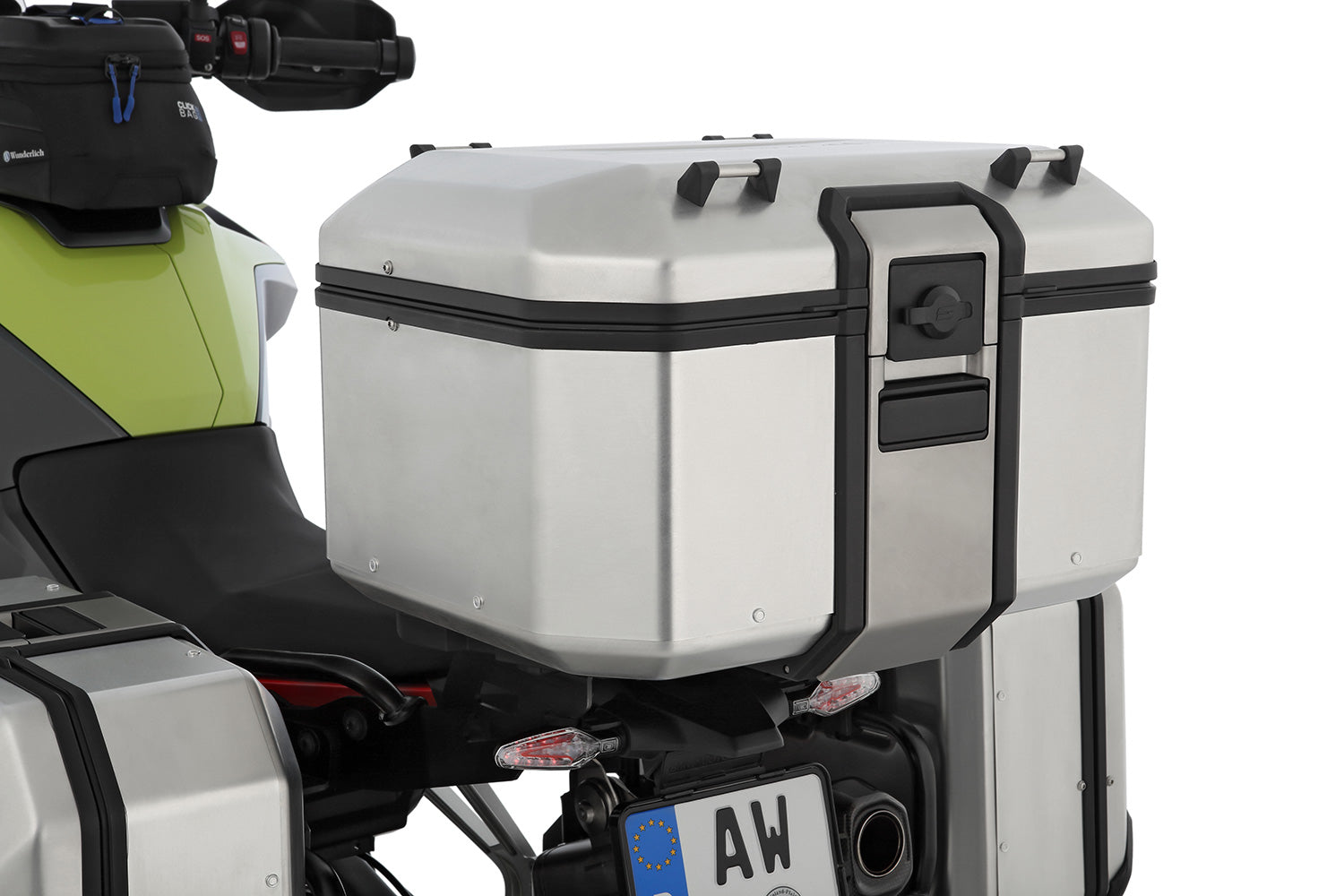 After opening the lock, the lid can be fully opened and the X-CASE topcase can be conveniently loaded from above. A custom-fit cap protects the lock from moisture and dirt. The lid is adorned with a high-quality embossed Wunderlich brand logo.