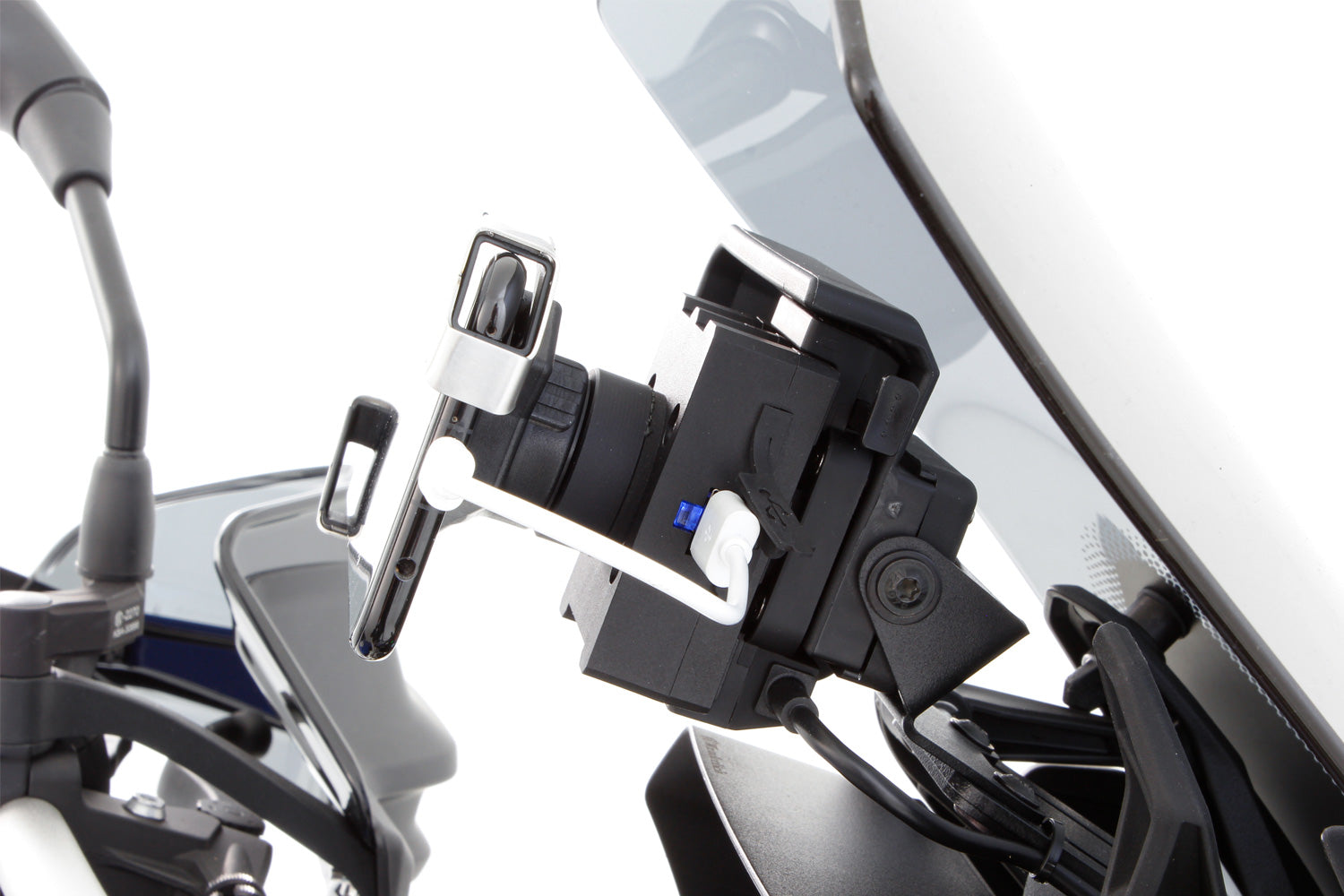 F750 GS | F800 GS 2023 on | F850 GS | F850 GS Adv | F900 GS | F900 GS Adv | F900 R | F900 XR | R1250 R | R1250 RS | R1250 GS | R1250 GS Adv | R300 GS | S1000 XR | M1000 XR | suitable for original Navigator V and VI bracketWunderlich USB charging box – SP Connect