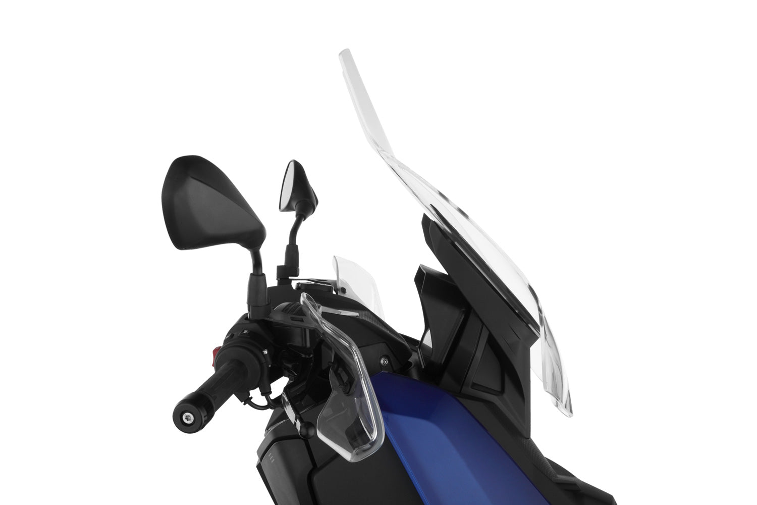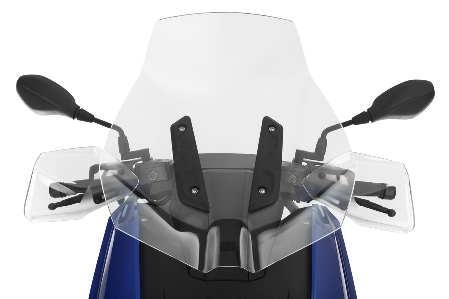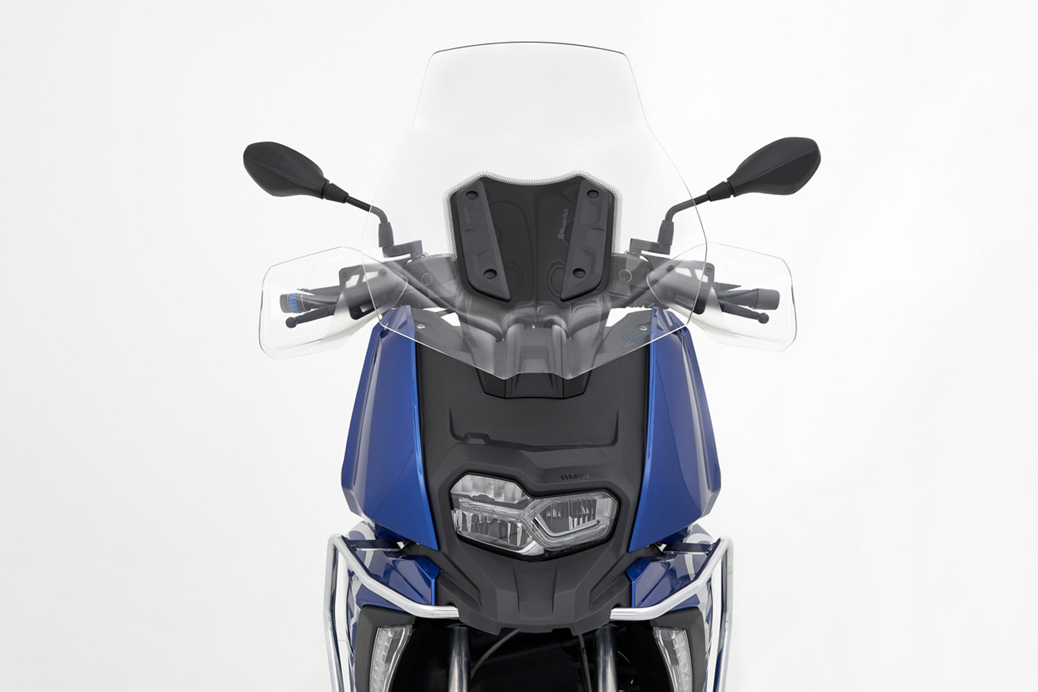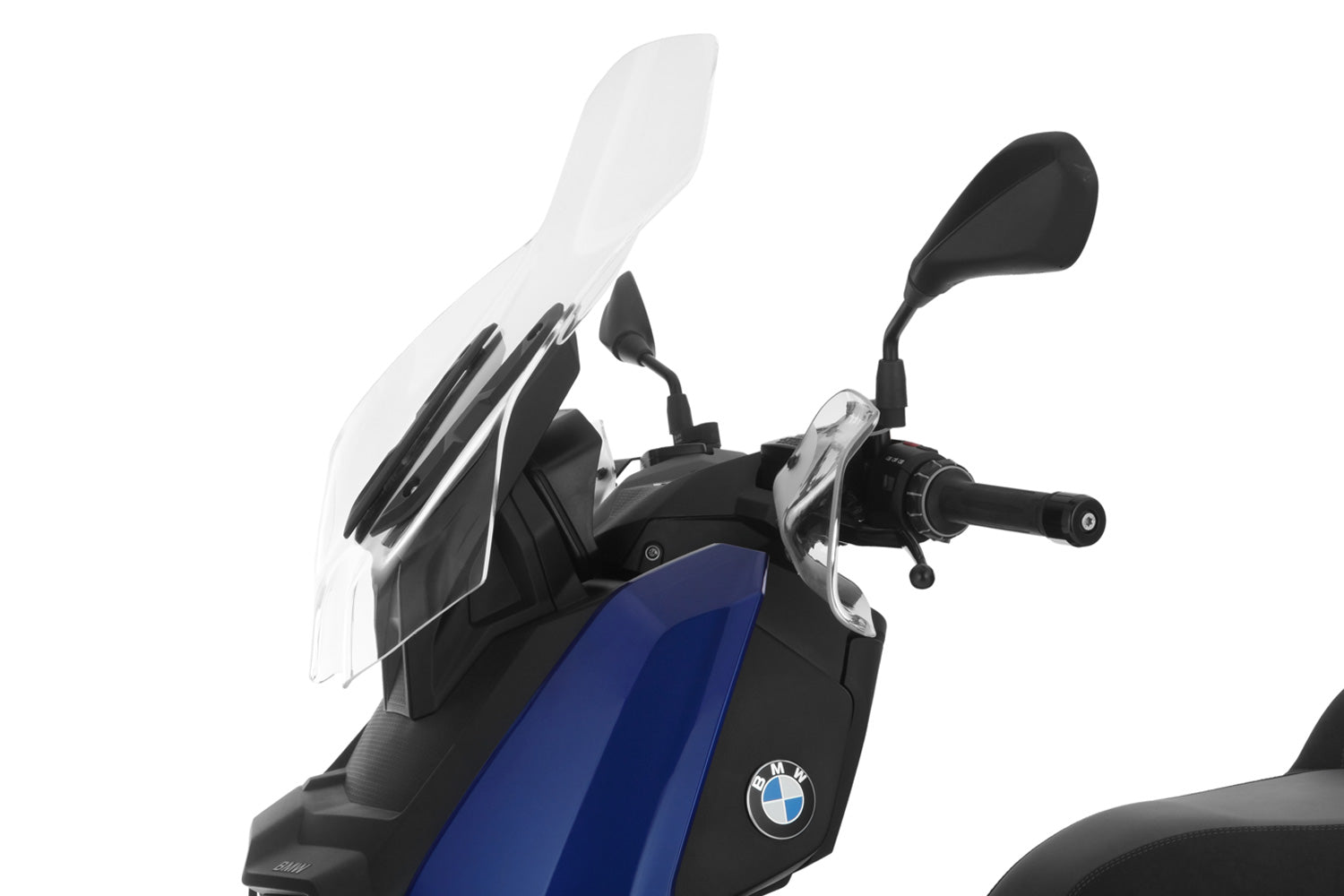 Our elegant, transparent "MARATHON" windshield provides optimum comfort and protection in the urban environment, on long tours and at high speeds. The windshield is angled towards the rider and aerodynamically formed so that it dampens turbulence effectively, softening it and reducing it to a minimum. This is helped by the fact that Wunderlich windshields come with a hand-polished rounded rim so that they fundamentally don't require any edge protection, which can cause additional vibrations, noises or turbulence. It is wider at the bottom than the original windshield and ensures perfect weather protection for all body sizes. It integrates perfectly into the overall layout of the C 400 X. It provides relief from wind pressure for the upper body, arms and body, especially at high speeds. The 5 mm-thick windshield made of high-quality PMMA is visually clean and provides a distortion-free view and optimum, clear vision. It is characterised by its high component stiffness, form stability and scratch resistance.