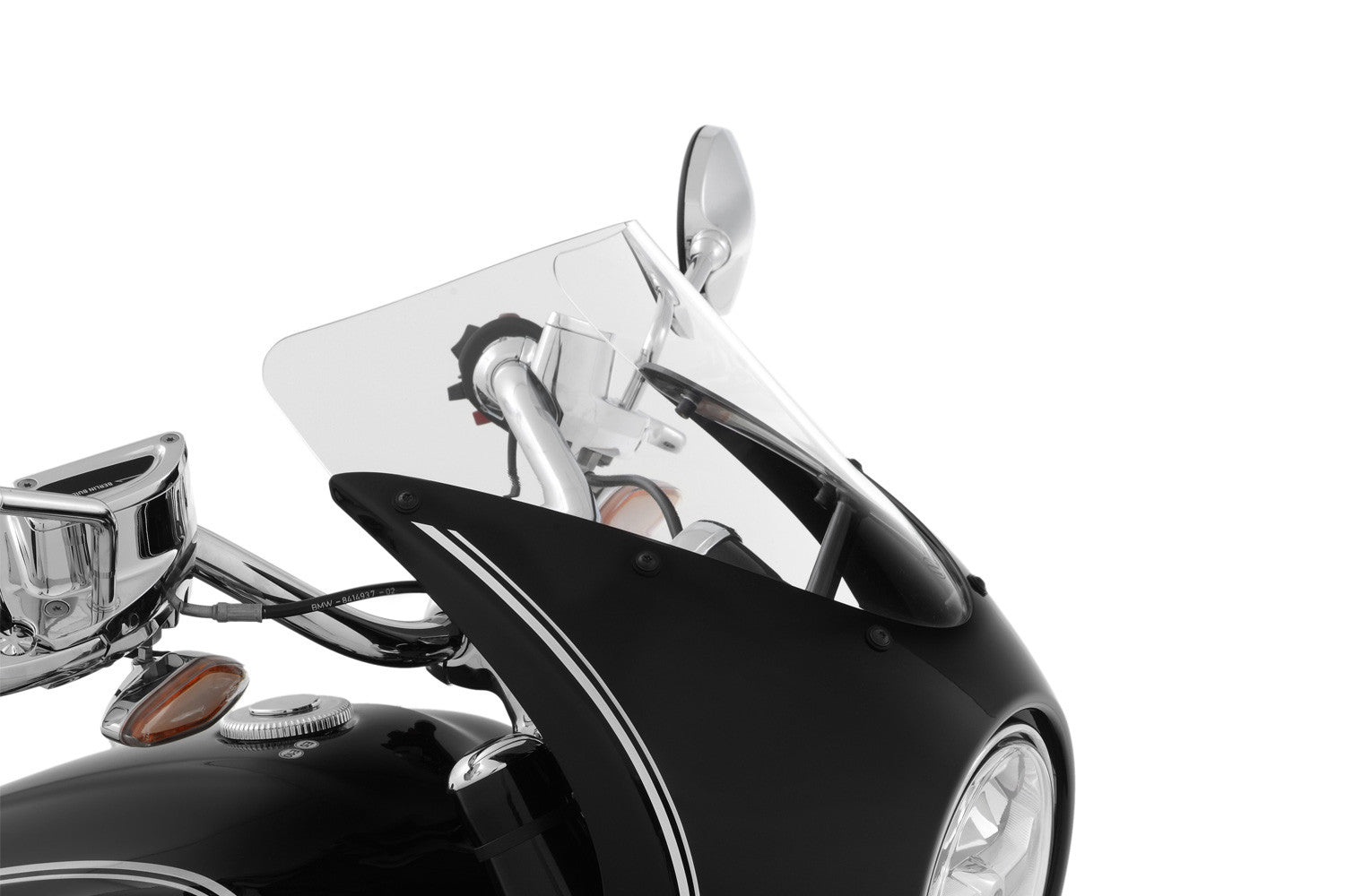 Our TOURING windshield - combined with our Rock ’n‘ Roll cockpit fairing - noticeably improves the touring and long-distance capability of the R 18 without causing the contour of the Cruiser to suffer – quite the opposite. Inclining towards the rider, the sophisticatedly cut, aerodynamic form of the compact windshield diverts the airflow during travel upwards and thus alleviates the wind pressure on the rider as desired. This is especially true at medium speeds. Together with our cockpit fairing, the integrated windshield ensures an overall optimised laminar airflow around the R 18.