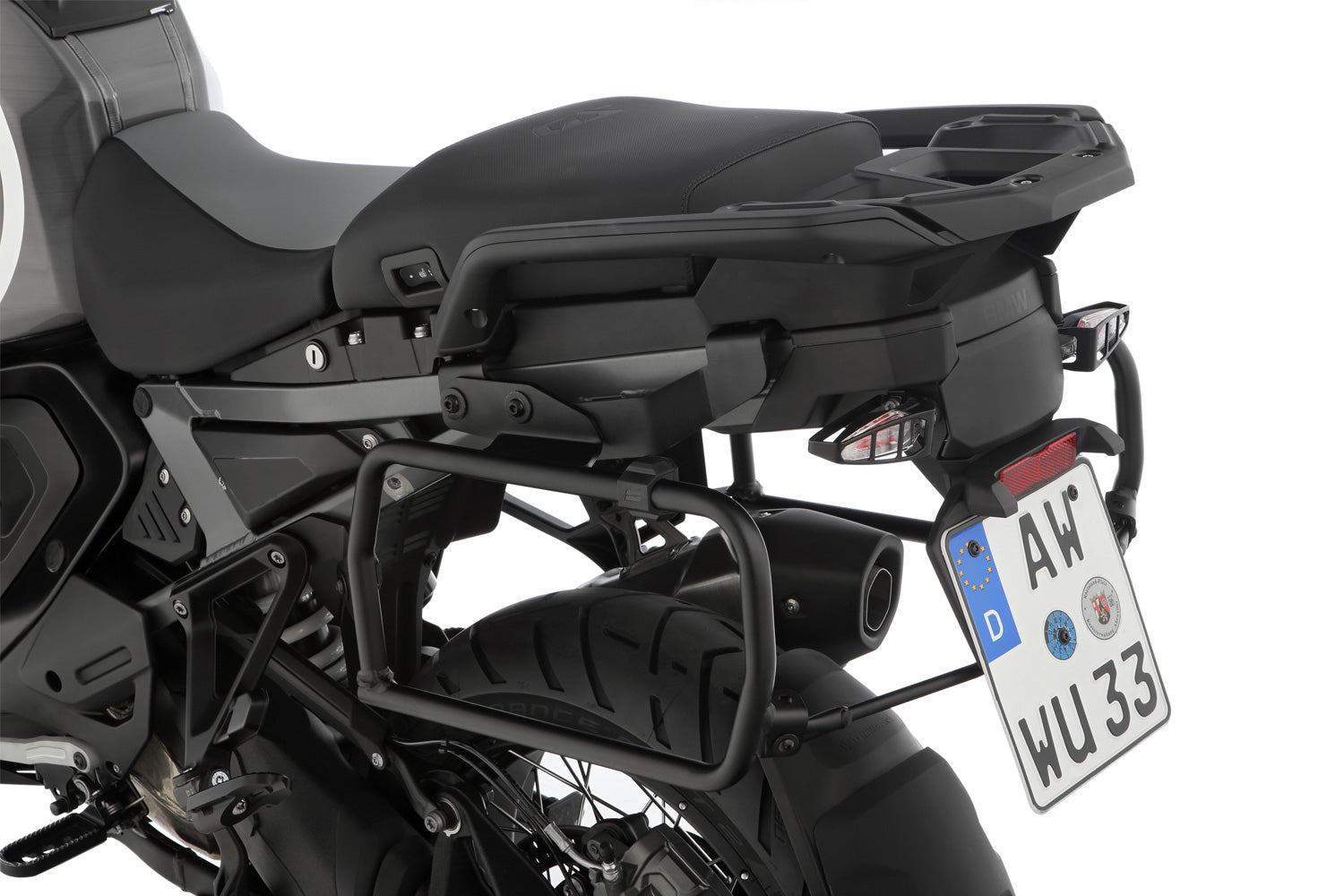 The X-RACK pannier rack is designed to accommodate the X-CASE X36 panniers or the X-BAG X32 soft luggage bags. The rack seamlessly integrates into the bike's side profile.